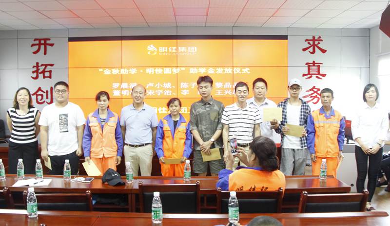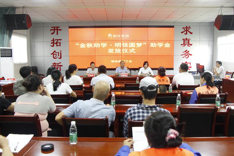 8月28日上午,明佳集團工會“金秋助學(xué)·明佳圓夢”助學(xué)金發(fā)放儀式在集團公司三樓會議室舉行,為8個考取大學(xué)的職工子女發(fā)放助學(xué)金共計9600元?偛藐愒、副總經(jīng)理鐘寒參加發(fā)放儀式,儀式由工會主席高斐斐主持。