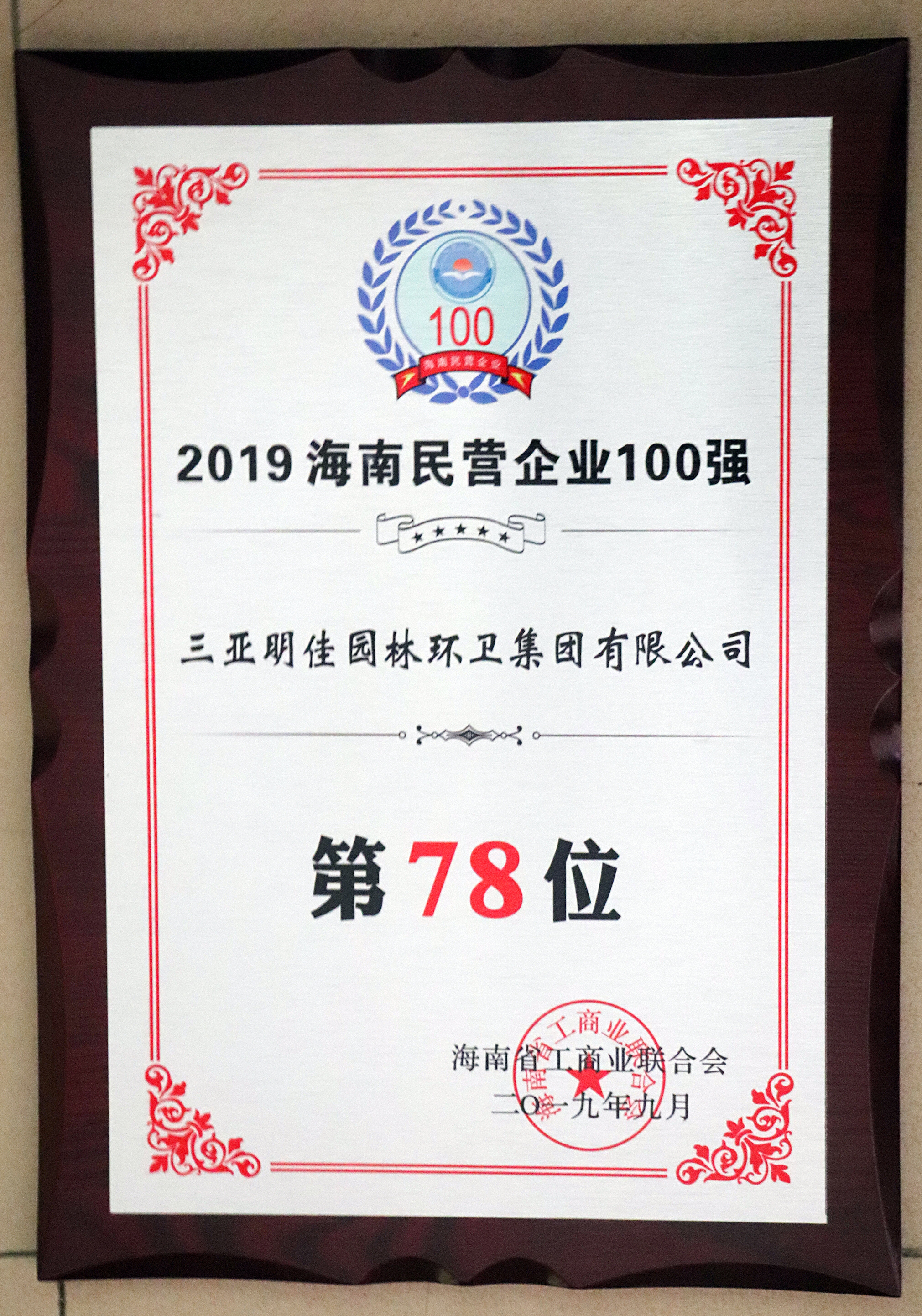海南省工商聯(lián)24日在?诎l(fā)布2019海南省民營企業(yè)100強,三亞明佳園林環(huán)衛(wèi)集團有限公司名列第78位。