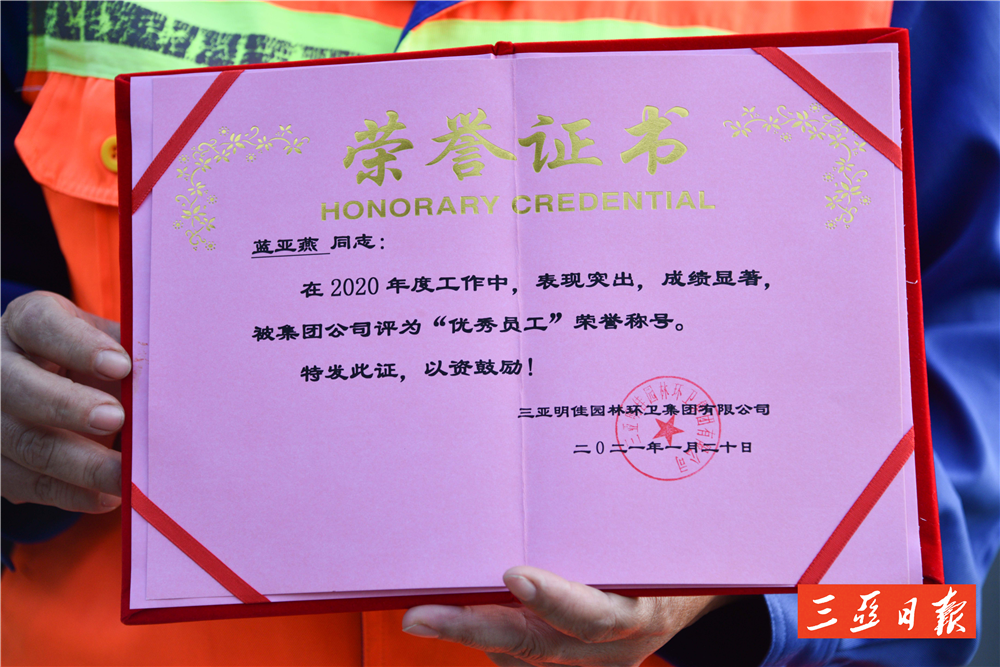 “亞燕是一個工作負(fù)責(zé)、認(rèn)真的員工,她工作讓我很放心,平時她還主動幫助其他工人,累活也搶著干!泵骷循h(huán)衛(wèi)天涯一隊隊長林海菊這樣評價藍(lán)亞燕。