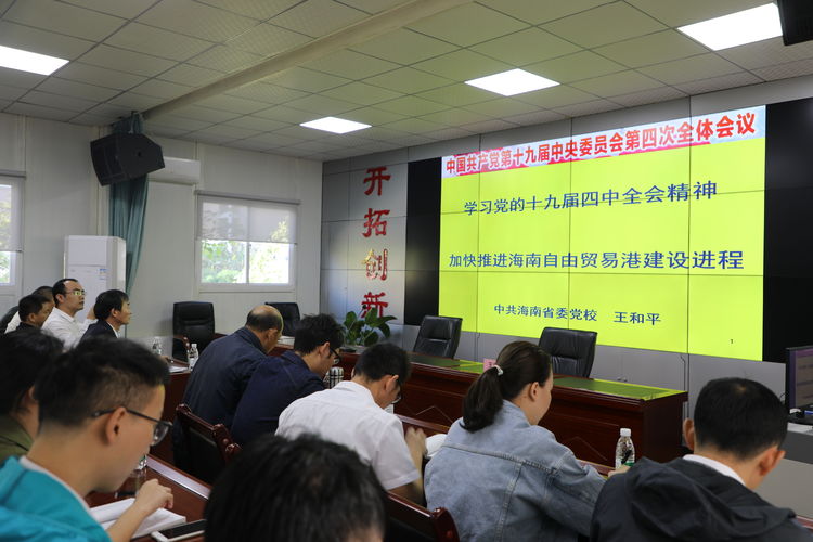 12月7日上午10:00時(shí),一場(chǎng)主題為“學(xué)習(xí)貫徹黨的十九屆四中全會(huì)精神,推進(jìn)海南自貿(mào)區(qū)(港)治理現(xiàn)代化”專題輔導(dǎo),在明佳集團(tuán)辦公大樓三樓多功能會(huì)議廳舉辦。此次專題輔導(dǎo)報(bào)告是明佳集團(tuán)黨支部為了落實(shí)上級(jí)指示,學(xué)習(xí)宣傳貫徹黨的十九屆四中全會(huì)精神,以及省委書記劉賜貴宣講黨的十九屆四中會(huì)全精神時(shí)提出的要求,組織黨員干部集中學(xué)習(xí),確保將黨的十九屆四中全會(huì)精神傳達(dá)至每一名黨員及一線員工。