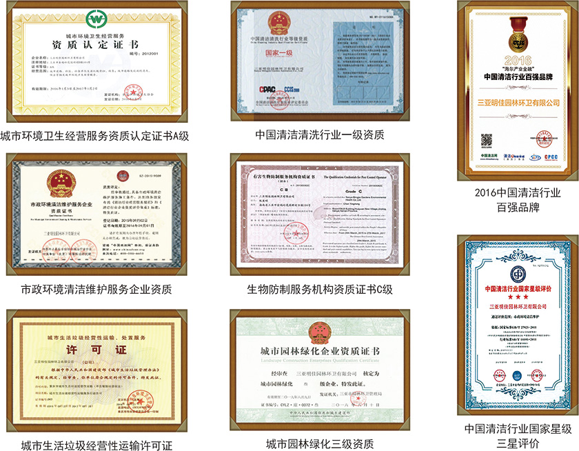 公司擁有建筑物外立面清潔養(yǎng)護施工甲級資質(zhì)、建筑物有害生物防治施工甲級資質(zhì)、建筑物日常清潔養(yǎng)護施工甲級資質(zhì)、中國清潔行業(yè)企業(yè)等級一級資質(zhì)證書、城市園林綠化企業(yè)資質(zhì)證書、有害生物防制服務機構資質(zhì)證書C級、有害生物防制服務機構C級資質(zhì)證書、中國清潔清洗行業(yè)國家一級等級資質(zhì)、城市生活垃圾經(jīng)營性清掃、收集、運營許可證;城市生活垃圾經(jīng)營性運輸、處置工作許可證、環(huán)境管理體系認證證書、城市環(huán)境衛(wèi)生經(jīng)營服務資質(zhì)認定證書(GB/T240012004/IOS14001:2004標準)、職業(yè)健康安全管理體系認證證書(GB/T28001—2011/OHSAS18001:2007標準)、質(zhì)量管理體系認證證書(GB/T19001—2008/iOS9001:2007標準)、市政環(huán)境清潔維護服務企業(yè)資質(zhì)證書
